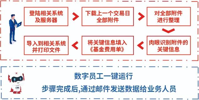 由于该月结费用单有多种格式,且常存在印章遮挡金额、日期、基金公司名称等关键信息,工作人员仅凭肉眼识别各单据中的关键信息,不仅效率较低且非常容易出错。同时,该业务处理的数据量大且对准确率要求极高,工作人员需要进行一系列重复操作下载保存附件,占用其大量的工作时间。02