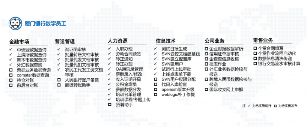 2021年3月,厦门银行启动数字员工项目,由信息技术部进行统筹规划设计,第一阶段重点建设企业级RPA服务能力,落地试点业务场景,验证平台能力;第二阶段扩充AI能力,搭建“RPA+AI”平台,拓宽业务应用场景,推出各类数字员工产品。