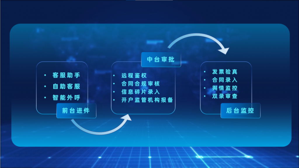 结合人脸识别、OCR、语音语义识别等AI技术,可实现开户远程鉴权、合同合规审核、信息碎片录入和监管报备等功能: