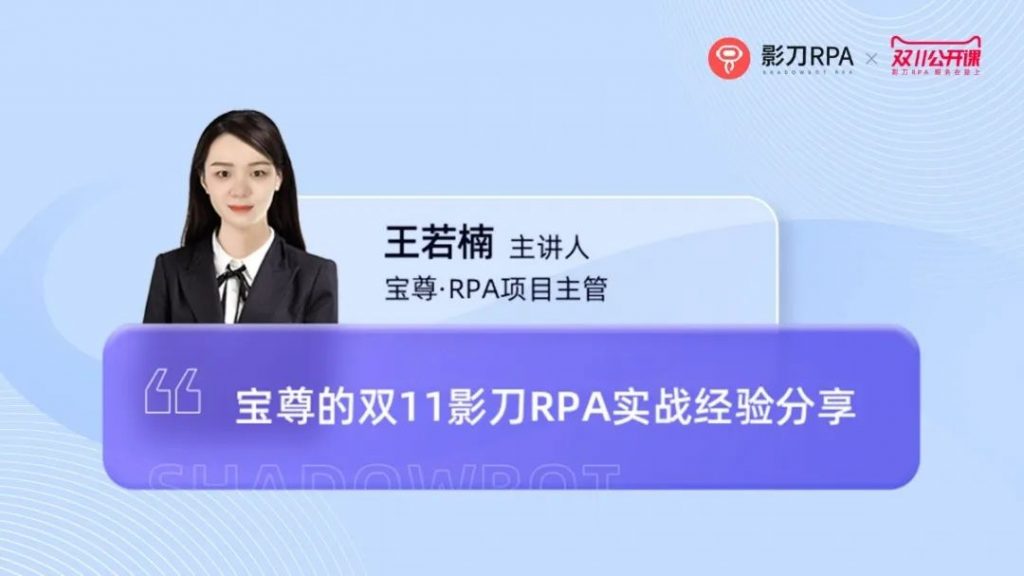 在10月21日的线上直播中,我们邀请到宝尊电商RPA负责人王若楠老师做客直播间,为大家分享《宝尊的双11影刀RPA实战经验》。让我们一起来看看宝尊日均运行6000+小时,月均节省300人力背后的秘诀。