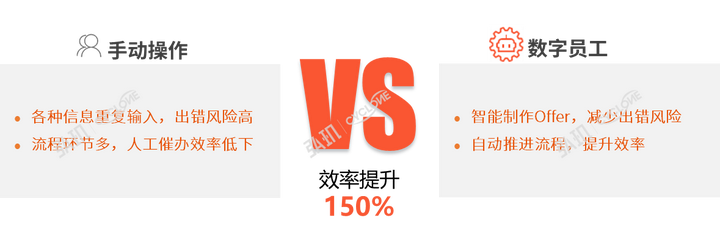 候选人通过面试后,招聘专员需要与其谈妥各项待遇,确认offer,直至候选人入职。在人工操作过程中,需要招聘专员手动制作offer,不仅格式上不够统一,审批过程慢,还会导致SSC专员为员工办理入职的时候带来流转上的不便,拉低一系列流程效率。弘玑Cyclone数字员工可以自动发起offer审批流,等待审批完成后根据模板自动制作候选人offer,并发至候选人邮箱,同时自动转发给SSC专员,极大提升效率。
