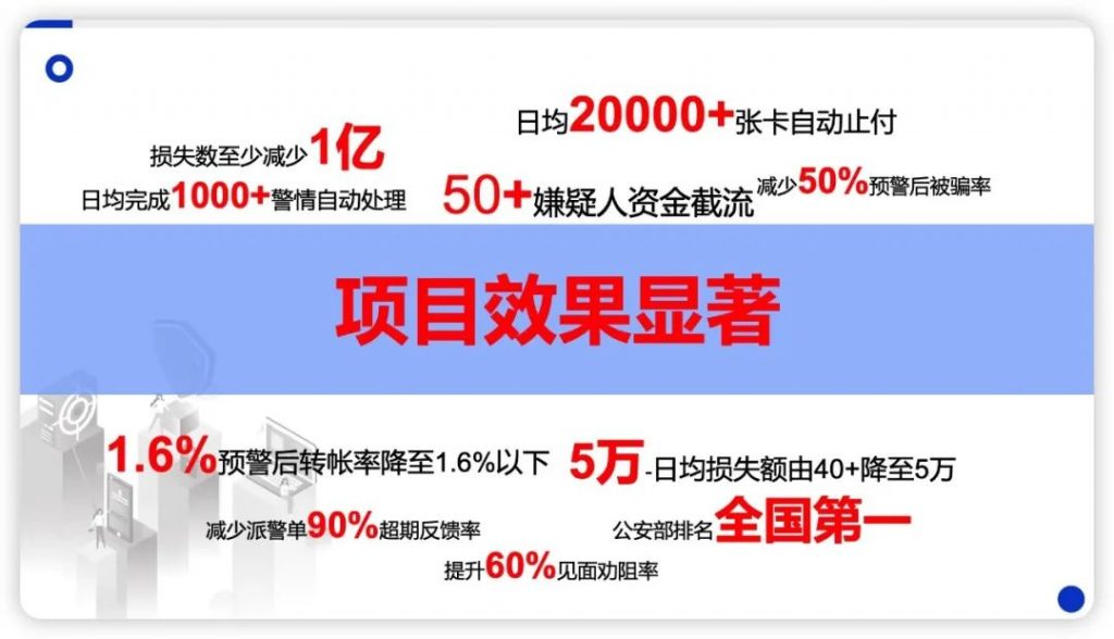 一、管理效益,利用数字化工具,重塑了公安反诈业务流程,实现“三减一提升”。同时实现反诈工作全流程、闭环的实时预警、实时劝阻、实时止付,释放大量警力,同时使管理更加简单高效,使原本复杂的大量的业务操作自动完成,缩短业务流程,提高管理质效,推动警务服务从被动管理模式向主动创新管理模式过渡,构建警务服务新模式。