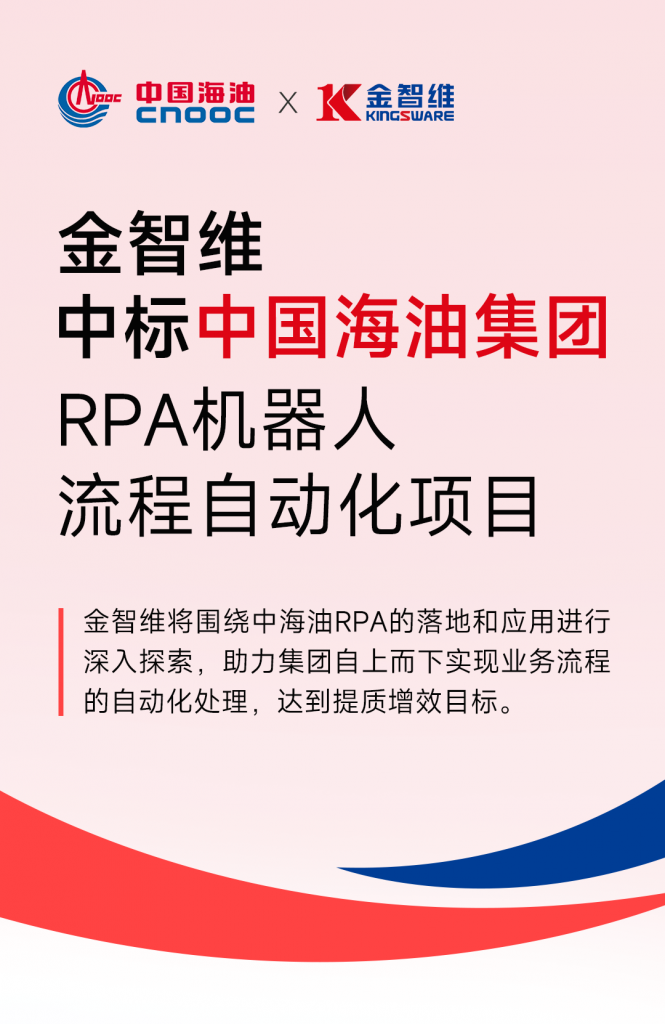 为进一步加快数字化转型步伐,为企业的可持续发展贡献力量,中国海油集团瞄准业务流程自动化平台建设,引入金智维RPA,对内部系统进行自动化和智能化改革,从而推动集团的精益管理,助力业务和办公效率提升。