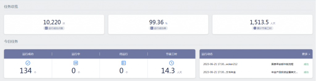 目前已搭建融合RPA与AI的数字化员工平台,用以协助全公司,投研、市场、运营三大体系10余个部门,涉及投研决策、量化ETF业务、市场营销、产品管理、资金跟踪提醒、场外基金跟踪、TA估值运营、资金核对、监管报送、IT系统运维、财务报销等多个场景,共部署 15 个数字化员工。公司通过采用数字化员工全替代和人机交叉复核两种模式,对大量日常性工作及流程进行改造,同时构建数字化员工统一监控平台,既提升了工作效率,又有效防范了风险。完成每日近万级信息与数据交互、业务执行,累计节省人工工时超 1500 人天,部分流程业务处理效率提升 100%,人工数据核对时间减少 60%,数据准确率达 99.36%,获得广泛良好反馈,在准确、高效的前提下切实提高了工作效率,减轻了业务人员的工作量,提高了准确率。尤其是在提升业务效率、强化业务流程执行规范、提升业务品质、增强客户体验等方面完成了新突破。