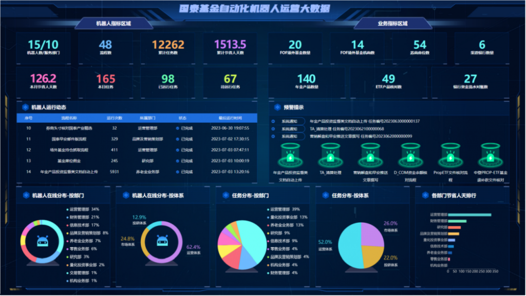 国泰基金作为产品线齐全的综合性、多元化的大型资产管理公司之一,同时也具有产品数量多、业务条线多元化、跨部门协作沟通繁复的特点,数字员工也成为打造内部运营数智化升级的重要能量。在零售、年金、品牌及营销策划、运营、IT、财务等多部门已部署超 10 个数字自动化场景进行内部运营效率提升,提升工作效率达 80% 以上。通过数字员工实现跨平台数据联动,产品管理平台与监管报送、数据中心、估值系统等平台打通,实现产品信息共享,解决信息孤岛问题。减少近80个信息重复录入工作,帮助中后台业务人员减少不必要的重复操作,提高工作效率。与此同时,养老金业务部通过数字员工自动处理邮件,实现对产品及时跟踪维护,并回复执行情况,累计处理248封邮件。定期批量自动化更新信息披露季报年报类文件,累计864份。每日自动化监控产品资金入账信息情况,及时通知客户经理、投资经理、风控等相关人员,帮助业务及时进行投资,提高产品资金运作效率,大大降低业务人员手工操作工作量。运营管理部通过数字化员工持续优化运营流程,自动处理头寸核对、监管报送、场外基金跟踪、ETF文件核对、资金余额核对等诸多繁琐手工操作,节省大量人力。
