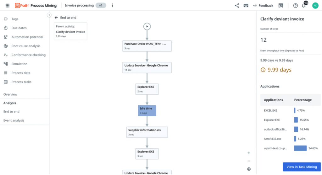 借助 2024.10 版本的新功能,UiPath 正在迈向流程统一视图的目标,将碎片化的数据转化为可操作的一站式视图,实现真正的端到端流程智能。该视图结合了流程挖掘与任务挖掘,避免盲目决策,基于数据提供了清晰的行动指引。此外,这一视图让用户能够在一个平台上同时获取系统级和任务级见解,从而对流程和任务实现精细的可见性,助力流程全面改善与转型。