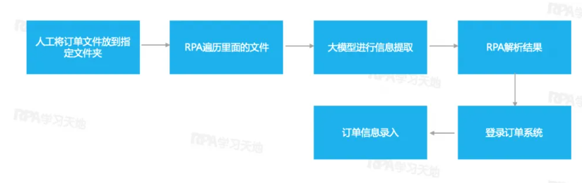 RPA 结合大模型技术,人工将订单放到指定文件夹,RPA机器人自动读取各种订单格式信息,并进行信息校验。然后自动登录订单系统,录入订单。极大提升了订单录入效率,释放了大量人力。