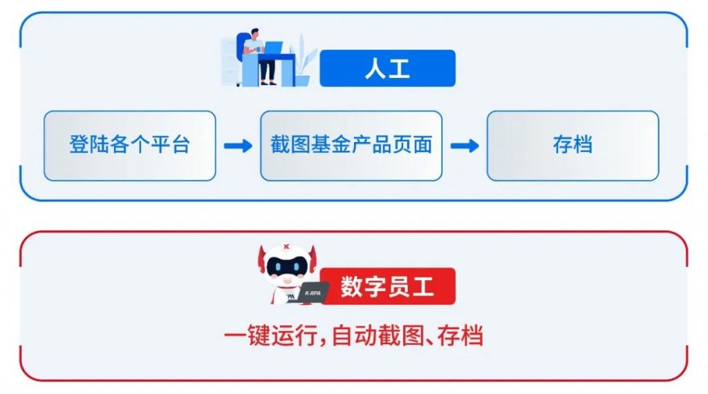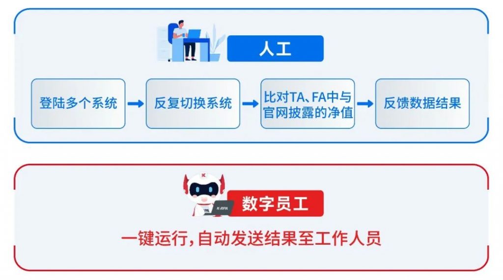 该业务引入RPA技术后,从净值数据从FA向TA、客户数据中心、公司官网等业务系统的导入到最终的核对,均由数字员工完成。由于以上系统已完全被连接起来,业务人员仅需查收结果即可,大大减轻其工作负担。