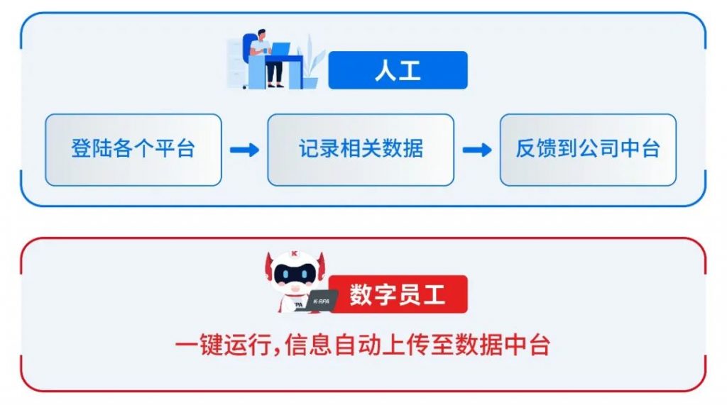 该业务引入RPA技术后,由数字员工获取所需的数据,并自动存放于数据中台,从而实现了两方面的进步:1.解放了人力,无需再每日人工记录;2.规范了数据,实现了此类外部数据的数据治理。这些数据落地之后,带来的正是数据业务化,后续新媒体运营便可依据数据快速做出决策。