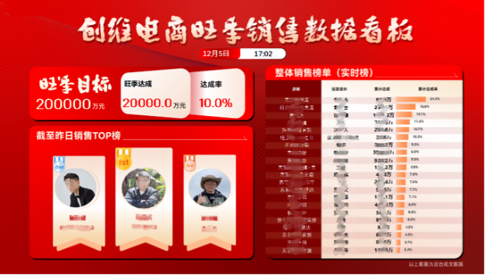 在团队的努力下,数据管理系统最终以看板形式呈现了出来,每五到十分钟自动刷新数据,不仅能够实时显示当天的销售情况,还能够累计周期内的数据,动态计算出当天和累计的Top 3店铺,计算各个单品的销售排名,帮助识别热销产品和滞销产品······