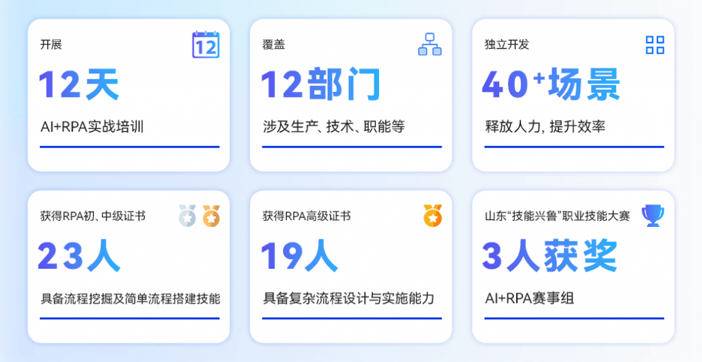 值得关注的是,在山东省工业和信息化厅等 7 部门联合举办的 “2024 年度山东省 ‘技能兴鲁’ 职业技能大赛”中,豪迈 1 名员工凭借精湛技艺在 “AI+RPA” 赛事组荣获一等奖,另有 2 名员工表现优异,斩获二等奖,充分彰显豪迈在 RPA 人才培养与技术应用方面的突出成效。