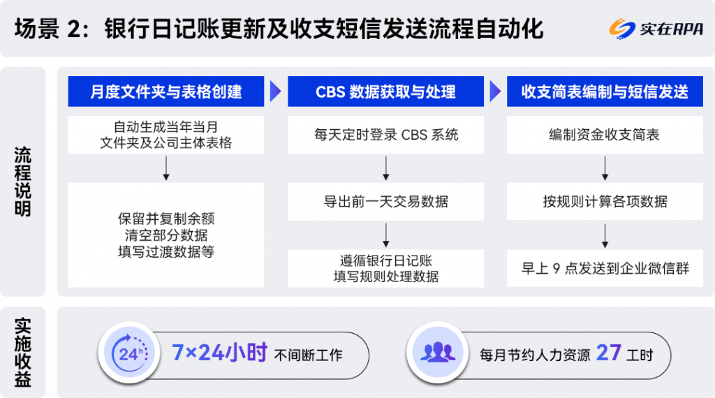 RPA 上线后,这一流程实现自动化。在下班时间,数字员工会自动登录 CBS 系统,依照预设指令执行数据导出、筛选等操作。同时,借助内置公式与算法,RPA 自动精准计算余额,确保余额数据准确无误,员工每天 9 点便能在企业微信群内准时收到编制好的资金收支简表。