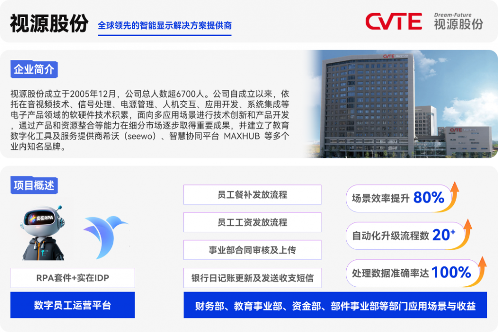 经过两年的深度合作与实践,实在智能助力视源股份实现超 20 个核心业务流程的自动化升级,覆盖财务部、资金部、教育事业部、部件事业部等多部门。在部分业务场景中效率提升达 80%,有力推动了视源股份自动化与智能化建设目标的达成。