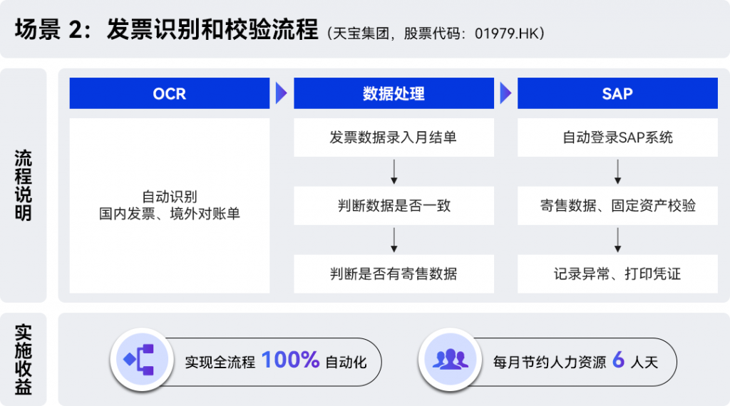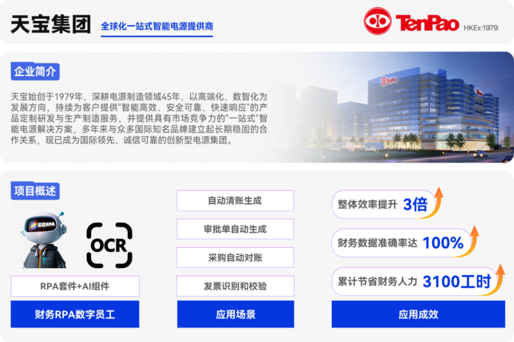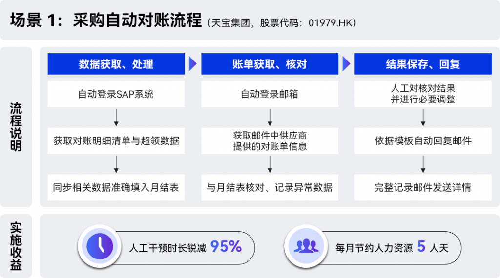 天宝集团与实在智能携手推进的 AI+RPA 项目,广泛覆盖采购自动对账、自动清账生成、发票识别 OCR 与 SAP 校验及审批单自动生成等多个关键业务场景,精准聚焦解决财务流程中现存的痛点问题,全方位提升工作效率与数据准确性,为企业财务稳健运营筑牢根基。