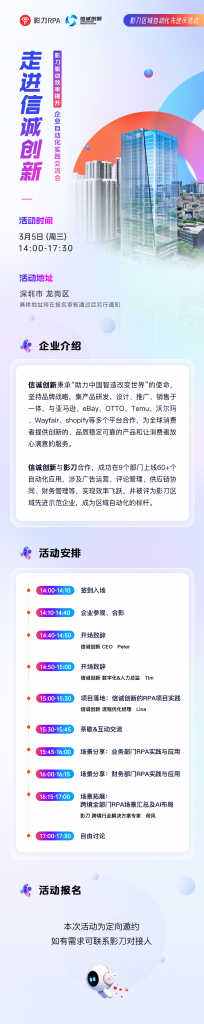 3月5日,影刀将举办「走进信诚创新」企业自动化实践交流会,带领跨境企业家们深入探索这一高效落地的秘诀,解锁RPA在跨境行业的实战应用。