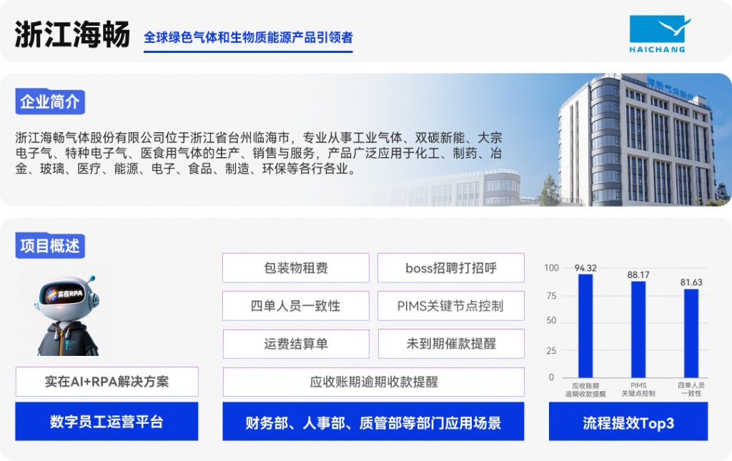 面对 AI,就像汽车诞生时一样,人们无需与之赛跑,而应该考个驾照。在浙江海畅气体股份有限公司(以下简称 “海畅”)的会议大厅里,50 余名来自各业务部门的 “AI 用户” 正学习实在智能 “数字员工” 的使用课程。AI 不再是高深莫测虚无缥缈的概念,而是具象化为拥有 “火眼金睛” 的财务数字员工,7×24 小时 “不眨眼” 的质检数字员工,招聘中 “对答如流” 的 HR 数字员工……