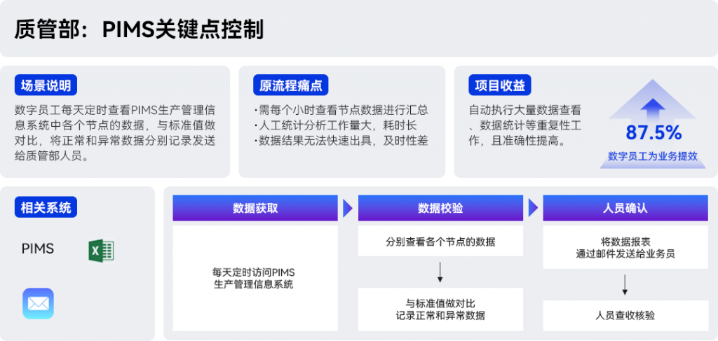相较于改造前,AI 数字员工每天定时访问 PIMS 生产管理信息系统,将各个节点的数据与标准值进行对比,质检周期从原先 120 分钟缩短至 15 分钟,减少 87.5%。质检员或站在数据大屏前,或通过手机邮箱,可以直接查看数字员工出具的质检报告,实时密切关注各类气体的质检状态。