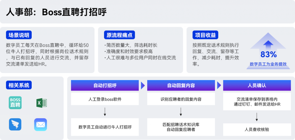 与人工操作相比,数字员工能够减少因 HR 状态和情绪等因素对招聘工作造成的影响,始终保持客观、中立、准确的标准,减少繁琐重复的基础 “打招呼” 工作,高效完成多岗位的招聘任务。