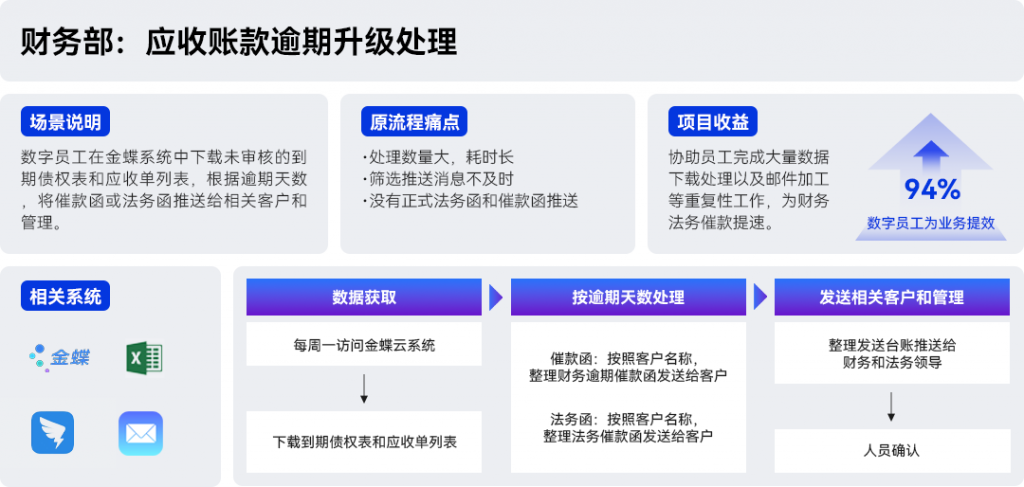 以 “应收账期逾期收款提醒” 为例,原流程处理数据量大、耗时久,对准确度和时效性要求极高。数字员工协助财务完成大量数据下载处理、邮件加工等重复性工作,并将催收结果邮件发送给相关客户和管理,实现了该业务 94% 的效率提升和 “零失误” 的标准化计算。