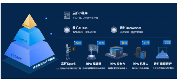 产品组成分为:云扩Spark,RPA编辑器、RPA控制台、RPA机器人和云扩流程银行五个主要功能组件,其它赋能组件还包括云扩工作台、云扩AI Hub和云扩Docreader。