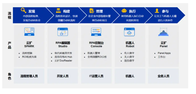 其中:云扩 Spark服务于有自动化需求的业务人员,通过在线工具箱轻松发现和梳理适合被自动化的工作任务,掌握自动化的主动权。
