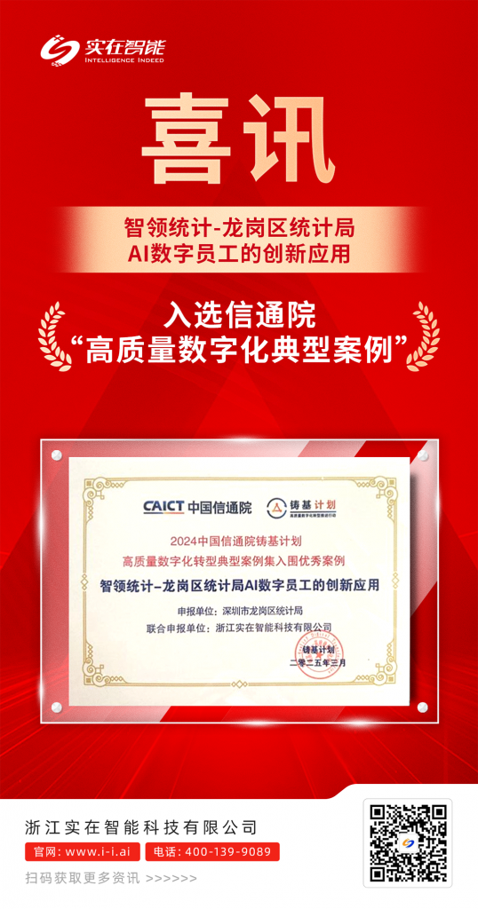 3 月 28 日,由工信部直属的中国信通院在北京举办 “铸基计划 2025 年度大会”,会上正式发布了《 2024 年度高质量数字化转型典型案例》评选结果。其中,实在智能与深圳龙岗统计局联合申报的 “智领统计-龙岗区统计局 AI 数字员工的创新应用”项目在 412 份案例申报中脱颖而出,入选《高质量数字化转型典型案例集》。