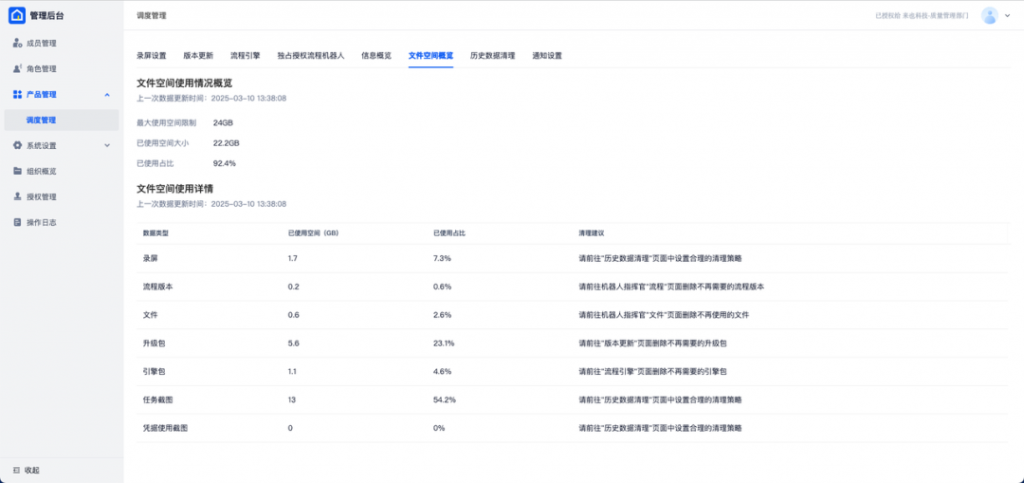 存储管理升级:支持所有文件类型的空间统计,管理员可设置历史数据自动清理策略,以保障系统的可持续稳定运行。