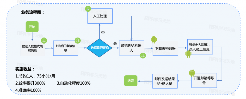 候选人按格式填写入职信息,HR将邮件转发给RPA,RPA下载数据,在HR系统中录入员工信息,并开通邮箱等账号。