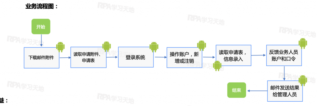 机器人自动下载业务人员申请邮件中的附件。登录业务系统,新建/注销员工账号,自动将申请表中的信息填入系统。办理成功后,通过邮件方式通知业务人员账号和口令。