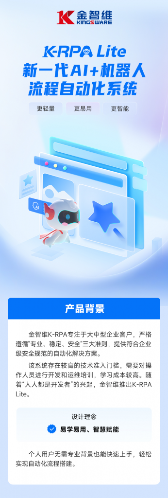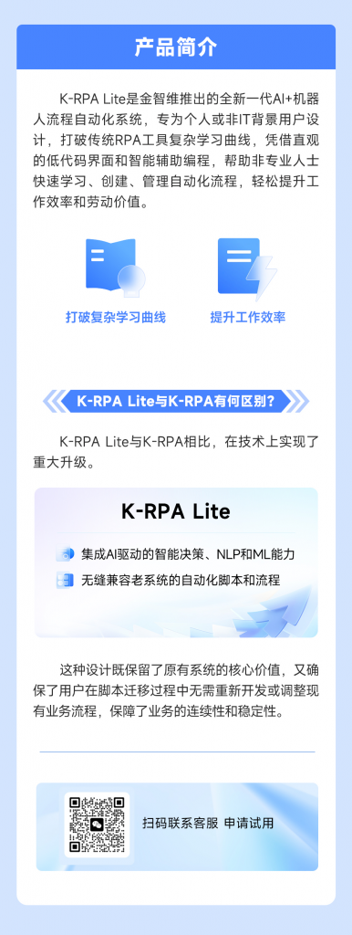 技术必须服务于人,而非束缚于人。金智维深耕企业数字化转型十余年,从千行万业的业务场景中淬炼实战经验,融合AI决策、自然语言处理与机器学习能力, 打造新一代AI+机器人流程自动化系统K-RPA Lite。