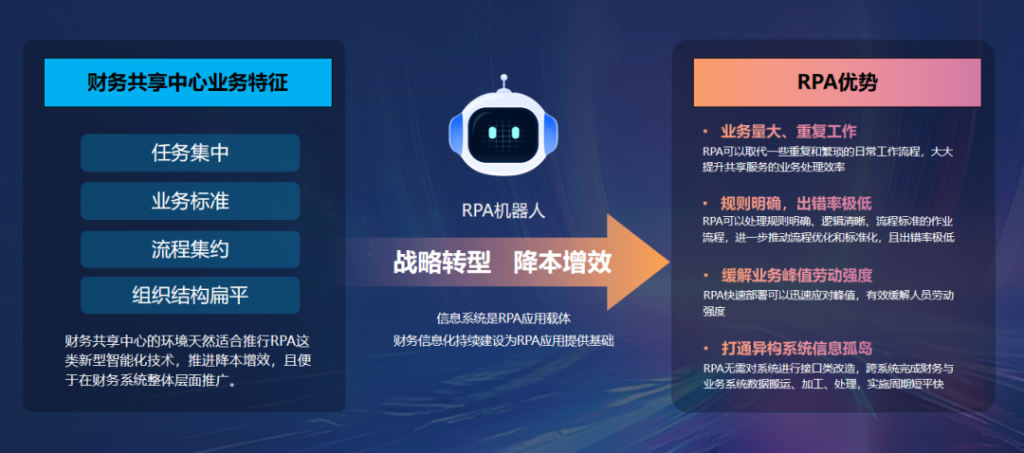 为应对这些挑战,上海机场引入了 RPA(流程自动化)技术。RPA 在解决业务峰值、重复操作等问题上具有独特优势,恰好契合财务共享中心任务集中、业务标准、流程集约、组织结构扁平的环境。