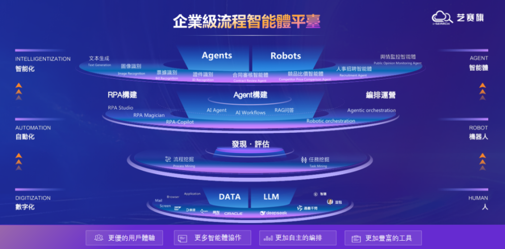 针对超自动化实施过程中的种种挑战,艺赛旗将AI大模型与iS-RPA(机器人流程自动化)、iS-RPM(流程挖掘)等产品融合,并于今年推出全新iS-Agent(企业级智能体),构建企业级流程智能体平台。