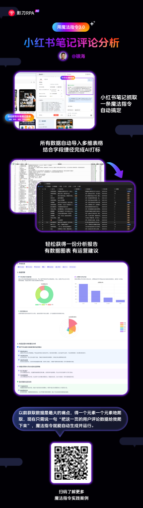 除了将数据采集到本地 excel,还可以借助影刀RPA+飞书多维表格+扣子空间,实现完整的 “数据采集-数据打标-数据分析” 工作流。银海分享了一个对于自媒体博主特别实用的场景“小红书笔记评论分析”,能助力博主挖掘用户需求、兴趣与共鸣点,给出优化选题的建议,提高转化效率。