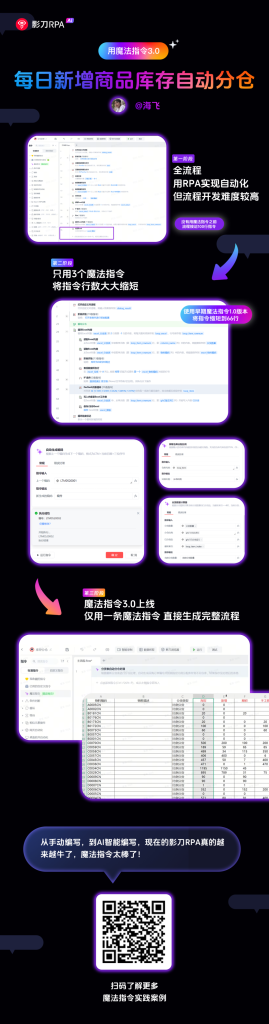 如今,影刀RPA全面升级魔法指令能力后,海飞仅用1个魔法指令就解决了原本100行流程的问题。