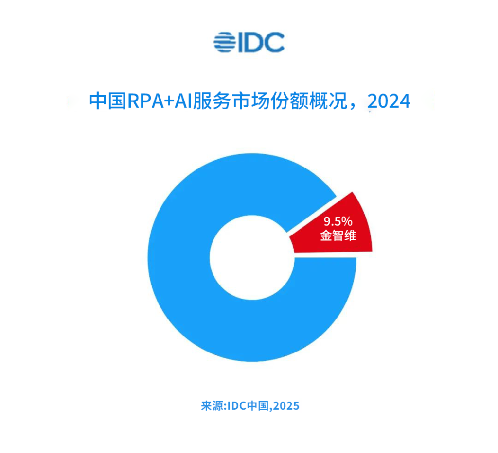 在2024年中国RPA+AI服务市场中,金智维以9.5%的份额位列第一,展现了其在交付与服务体系上的领先地位。