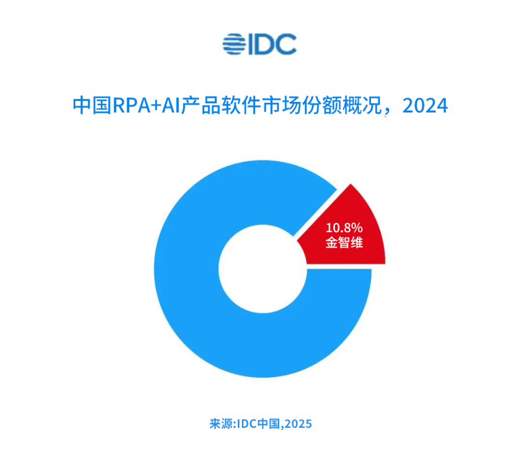 根据IDC报告,2024年中国RPA+AI产品软件市场正持续扩容,其中金智维以10.8%的市场份额稳居头部阵营,产品能力在行业中受到持续认可。