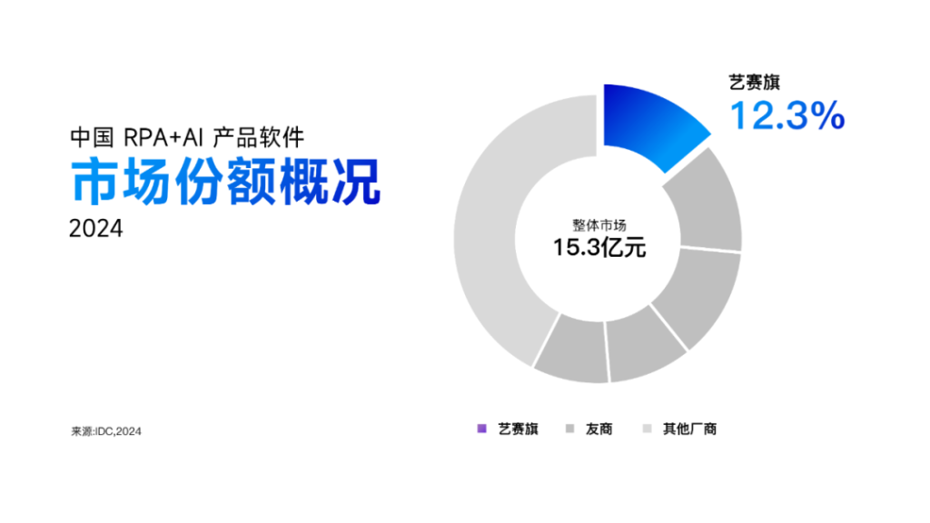 IDC报告显示,尽管2024年中国RPA+AI市场竞争格局因AI Agent技术的爆发而趋于分散,艺赛旗仍凭借其在企业级流程智能体平台方面的卓越表现,以12.3%的份额拔得头筹,成功领跑中国RPA+AI产品市场。