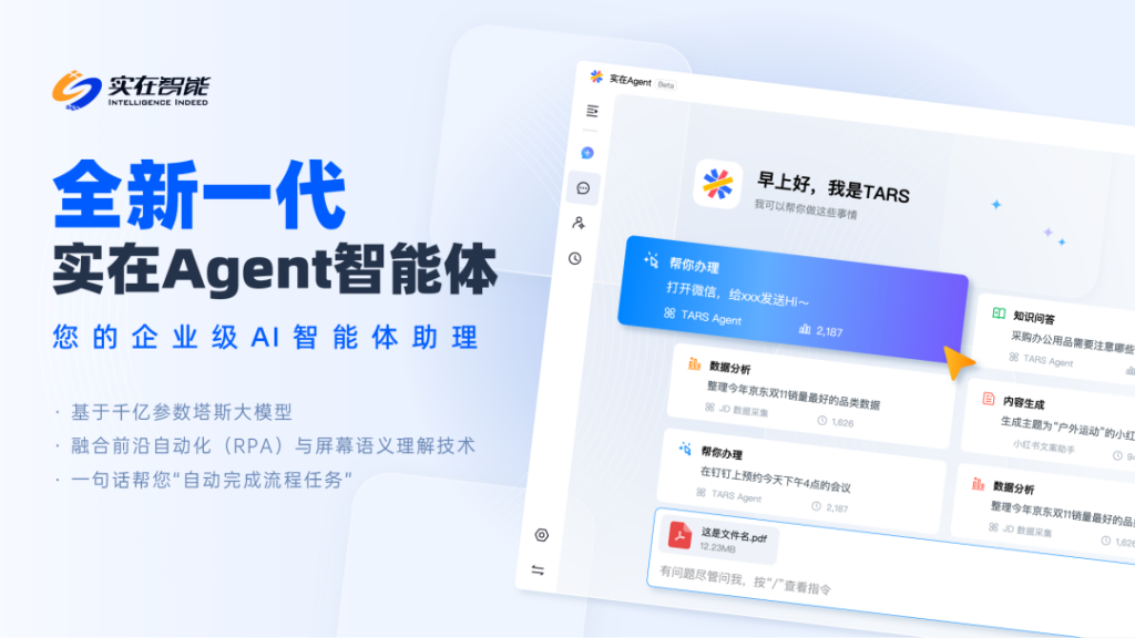 实在智能基于自研的塔斯大模型,推出了国内首款企业级通用智能体——实在Agent,支持用户通过自然语言描述,将业务需求快速转化为可执行的自动化流程,真正实现“一句话生成数字员工”的创新应用。