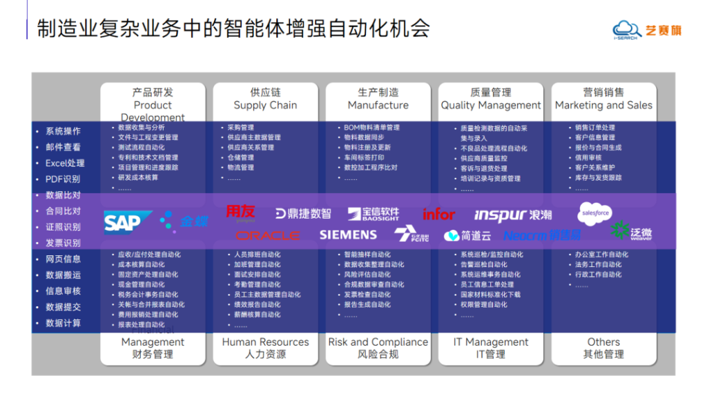 制造业作为国民经济的重要支柱,正面临着数字化转型的关键时期。李博先生深入剖析了制造业复杂业务中的智能体增强自动化应用机会,涉及产品研发、供应链、生产制造、质量管理、营销销售等多个核心环节。从数据收集分析、文件管理、流程自动化到业务决策支持,都能发挥关键作用,助力企业优化业务流程、提升生产效率、降低运营成本。