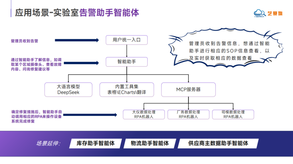 艺赛旗展示了多个实际应用案例。例如,管理员可以通过实验室告警助手智能体获取信息,包括调取特定区域摄像头、查看故障详情等。确定修复方案后,智能助手能自动调用相应的RPA流程,操作设备系统完成修复。基于这一模式,还可拓展出”库存助手智能体”、”物流助手智能体”、”供应商主数据助手智能体”等多种应用场景。