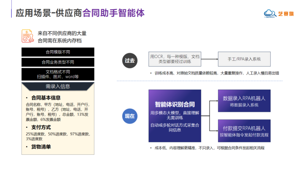 供应商合同助手智能体采用多模态大模型技术,与传统训练模式不同,它无需专门训练就能直接解析各类合同内容,包括不同模板、业务类型和文档格式。该智能体不仅能低成本实现高精度内容理解,除了具备基本录入功能,并能根据合同条款自动触发相关业务流程。