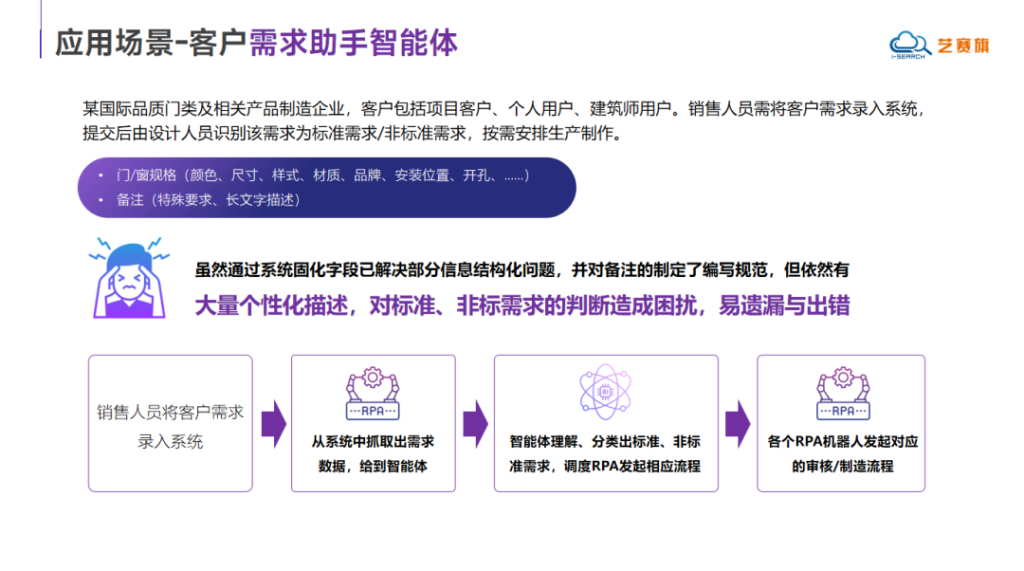 某国际知名门类及配套产品制造企业在销售流程中面临需求分类的挑战。销售人员需要将客户需求录入系统后,由设计人员判断该需求属于标准需求还是非标准需求,以便安排相应的生产计划。由于客户需求种类繁多,虽然企业已通过系统预设字段实现了部分信息的结构化处理,并制定了备注填写规范,但仍存在大量个性化描述,导致标准与非标需求的判断困难,容易出现遗漏和错误。为解决这一问题,客户需求助手智能体能够自动识别和分类 标准与非标准需求,并通过RPA技术触发相应的业务流程。