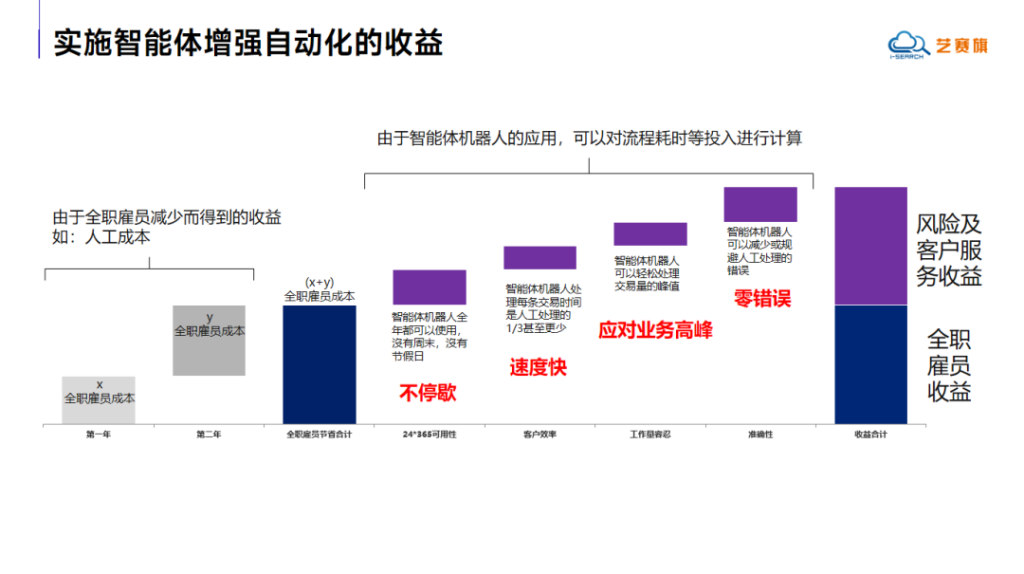 在演讲的最后,李博总经理介绍了实施智能体增强自动化为企业带来的显著收益。智能体机器人具备全年不间断运行、处理速度快、应对业务高峰能力强、准确性高等优势,能够大幅节省全职雇员成本,降低人工错误率,提升客户服务效率与质量,为企业创造可观的经济效益与社会效益。