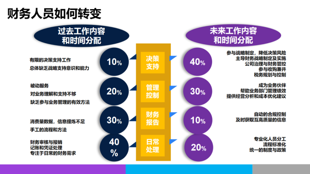 王攀强调,传统财务管理正加速转型,标准化、重复性事务(如财务核算)逐步由自动化工具承接,推动财务职能从 “事务处理” 向 “战略支持” 迁移,在未来,将会把更多资源投向参与战略制定(如收购兼并、税务规划)、为业务部门提供经营分析与成本优化建议,以及通过智能工具实现合规控制等领域。