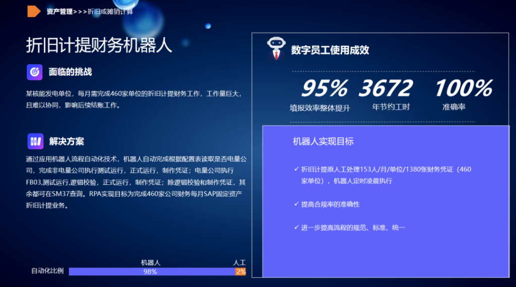 为了让嘉宾更好地理解 RPA 在财务中的应用,郭娟拆解了多个经典案例,如马拉兹公司的支付指令录入自动化、某电力有限公司的供应商清账、某核能发电单位的折旧计提财务工作以及某制造企业的网银流水余额查询等。这些案例展示了 RPA 在提高效率、降低成本、提升准确性等方面的显著成效,例如某核能发电单位通过 RPA 实现折旧计提,准确率达 95%,填报效率整体提升 100%,年节约工时 3672 小时。