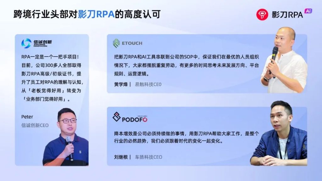 信诚创新CEO Peter表示:“RPA一定是一个一把手项目!目前,公司300多人全部取得影刀RPA高级/初级证书,提升了员工对RPA的理解与认知,从「老板觉得好用」转变为「业务部门觉得好用」。”