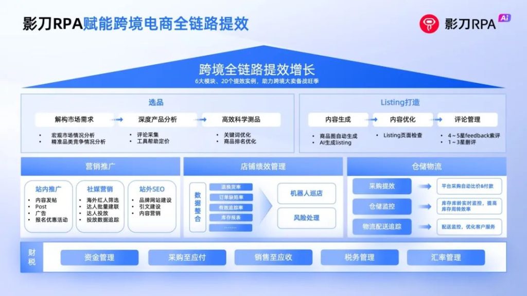 影刀RPA的优势不仅在于标杆案例的验证,更在于对跨境运营全链路的深度覆盖。从选品到售后,从营销到财务,影刀RPA以“RPA+AI”的双轮驱动,构建了覆盖6大模块、20+提效场景的完整图谱。