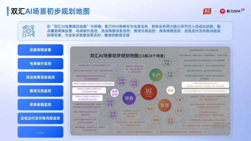 在双汇最新规划的AI场景地图中明确,影刀RPA将率先为电商业务、财务业务两大核心环节注入自动化动能,重点覆盖舆情监管、电商破价监控、竞品销售信息监控、费用兑现监控、库容库貌监控、应收应付及坏账风险监控等场景的自动化,为业务决策提供更及时、精准的数据支撑。