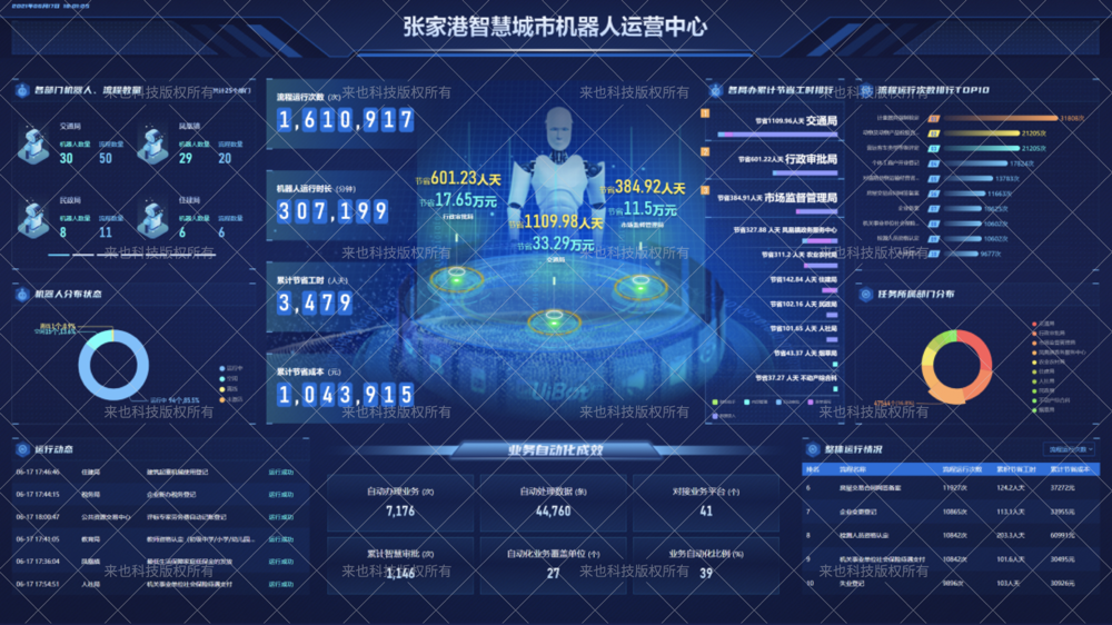 在江苏省张家港市智慧城市机器人运营中心平台,一群“不知疲倦”的机器人正在不间断工作。从 2020 年底开始,由张家港市大数据管理局主导,张家港市行政审批局牵头,大数据公司、来也科技负责具体落实和实施,建立“智慧政务流程自动一体化平台”联合工作组,对张家港行政审批大厅一网通办涉及相关业务进行调研,重点关注“二次录入”“跨网数据同步”问题,全力打造“数字劳动力”,助力张家港市实现“秒办秒批”“智能审批”等。