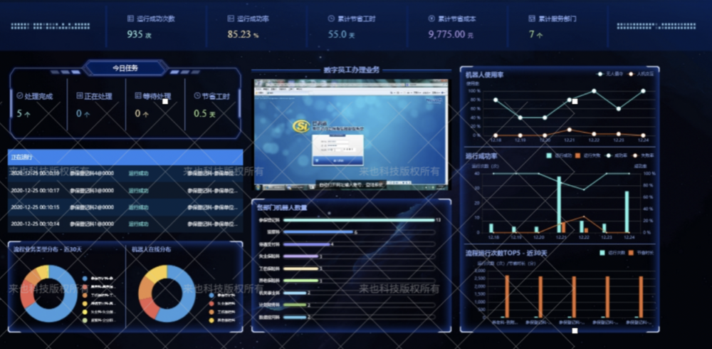 为更直观更全面掌控软件机器人工作运行状态,兰州市社保中心还部署了软件机器人运行驾驶舱,对运行成功次数、运行成功率、累计节省工时、累计节省成本、机器人在线分布等数据进行实时监测,确保软件机器人的运行稳定及可追溯等。